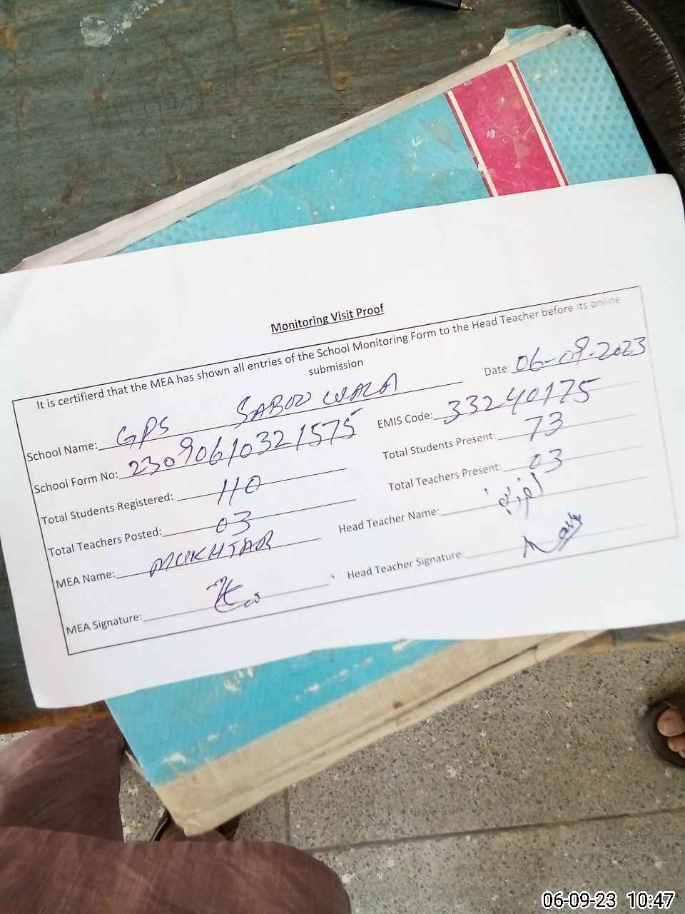| Attendance Register | Head Teacher | MEA with School | Visit Proof |
