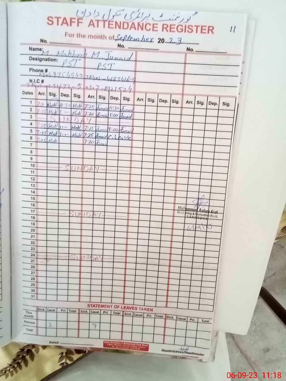 | Name: MU**** JU**** Designation: (School Headmaster's/Headmistress's) PST Phone/Cell Number: 03**** |