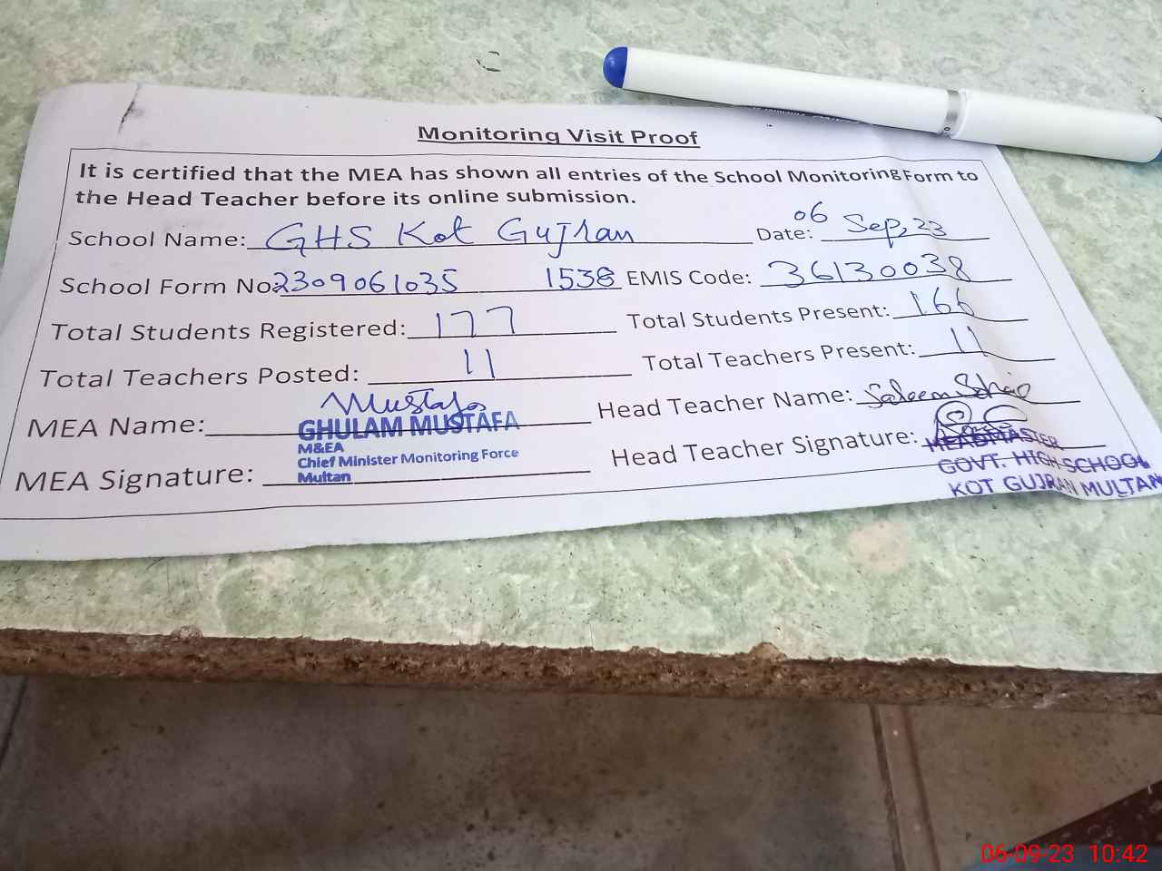 | Attendance Register | Head Teacher | MEA with School | Visit Proof |