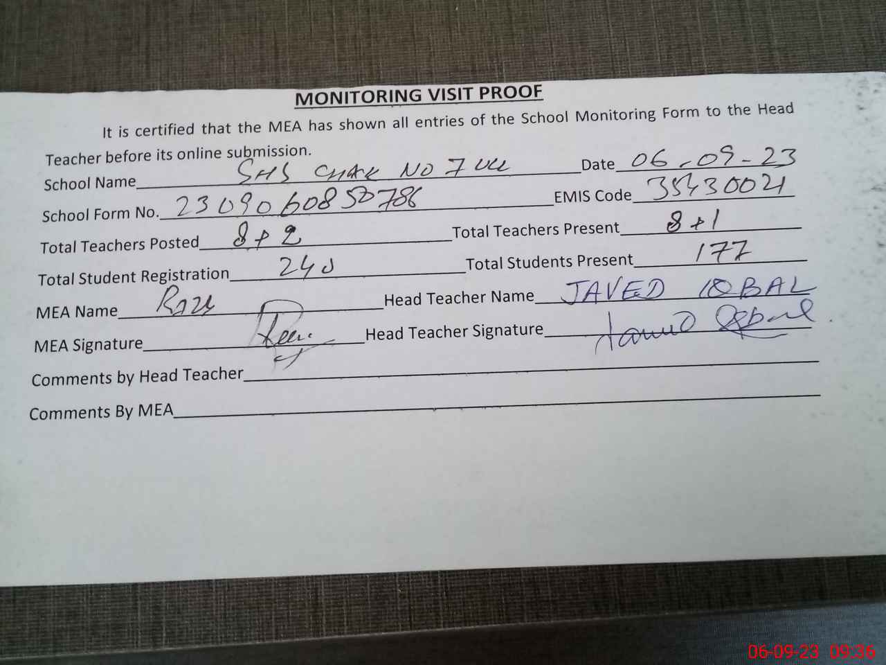 | Attendance Register | Head Teacher | MEA with School | Visit Proof |