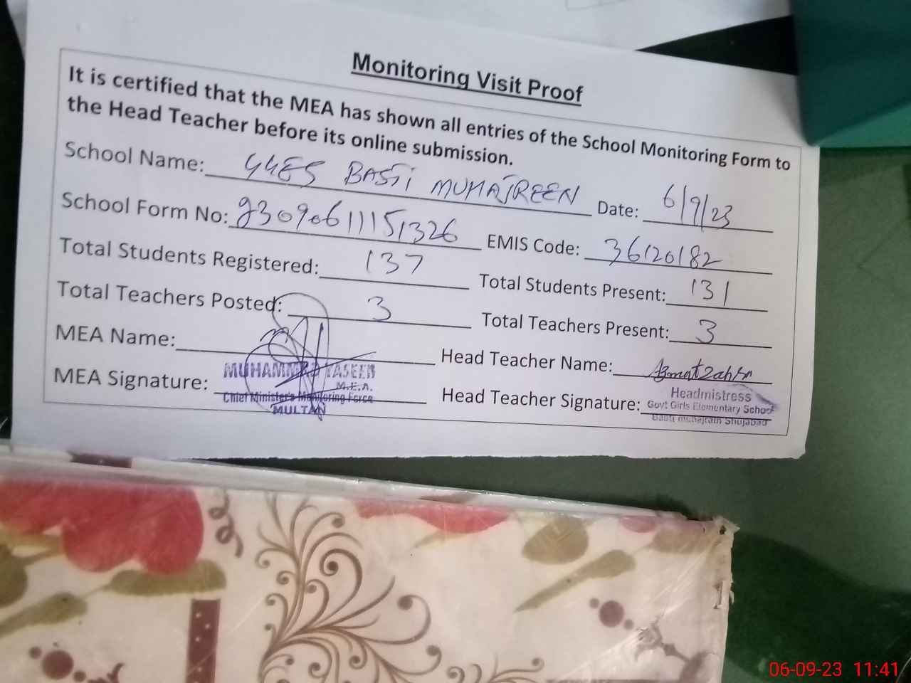 | Attendance Register | Head Teacher | MEA with School | Visit Proof |