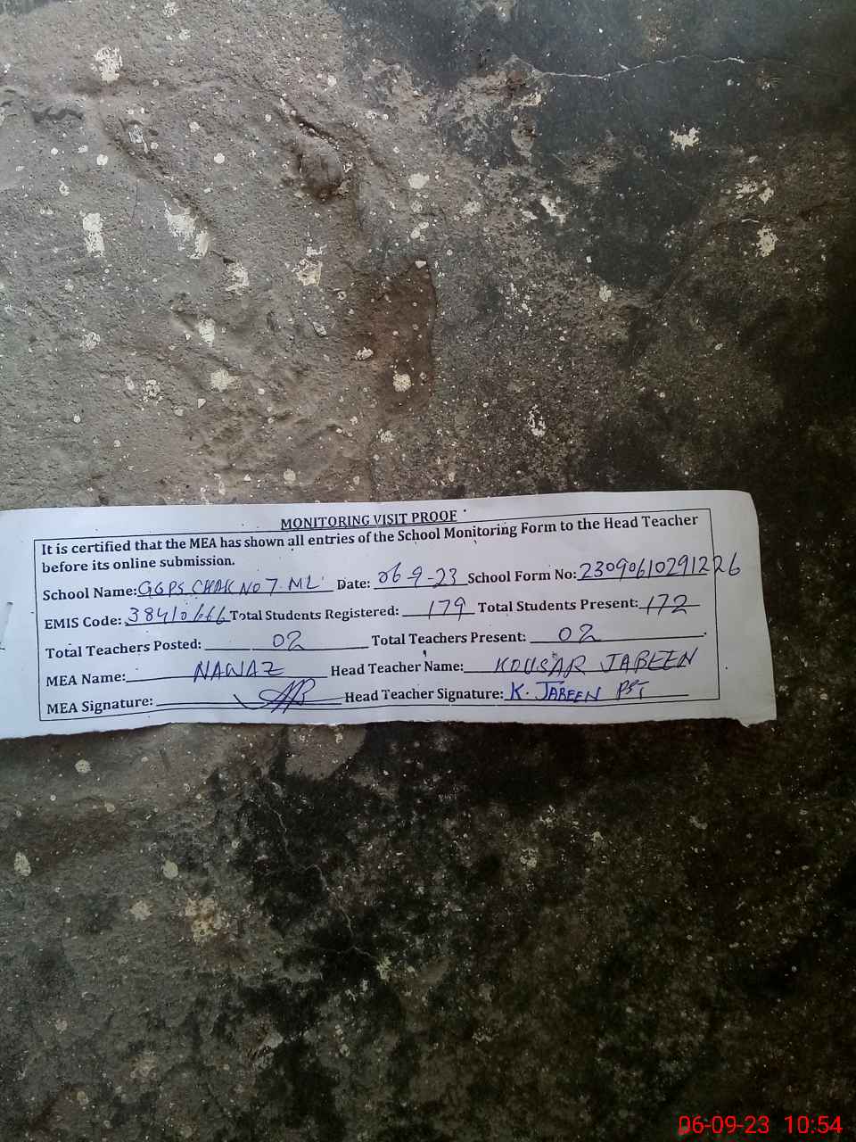 | Certified that this School was Inspected by the Undersigned MEA/DMO Today and the Information Stated Above is as Per Record. | |||||