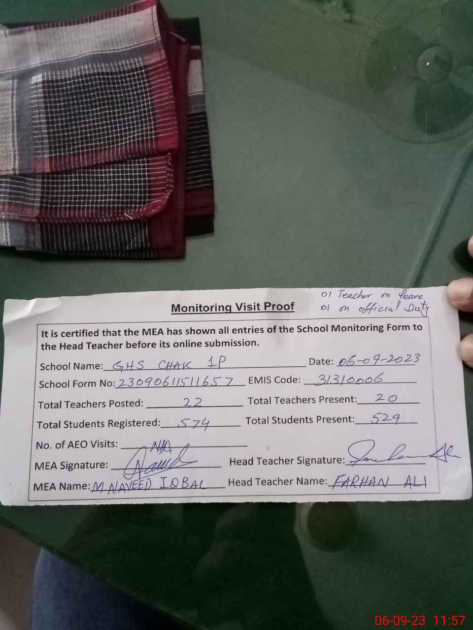 | Attendance Register | Head Teacher | MEA with School | Visit Proof |