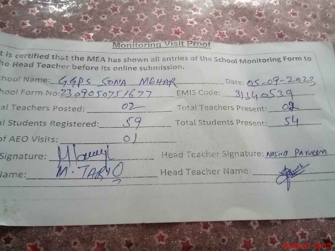| Attendance Register | Head Teacher | MEA with School | Visit Proof |