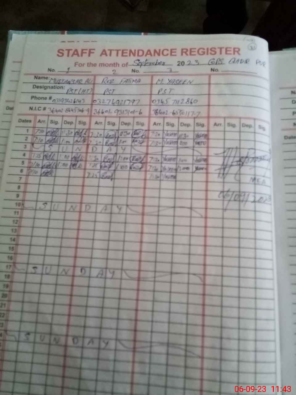 | Name: Mu**** Al**** Designation: (School Headmaster's/Headmistress's) PST Phone/Cell Number: 03**** |
