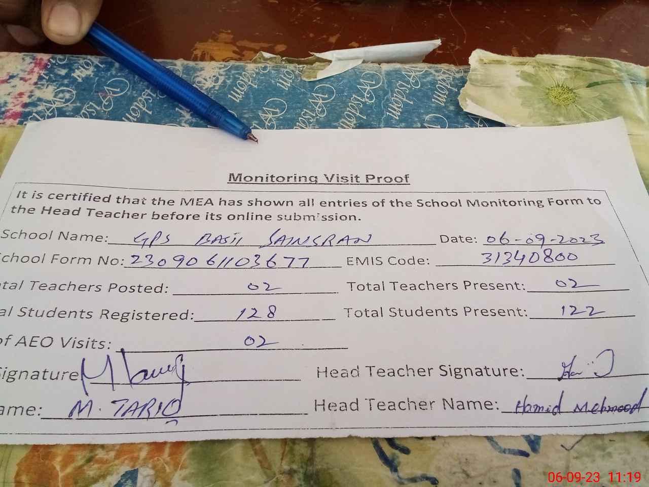 | Attendance Register | Head Teacher | MEA with School | Visit Proof |