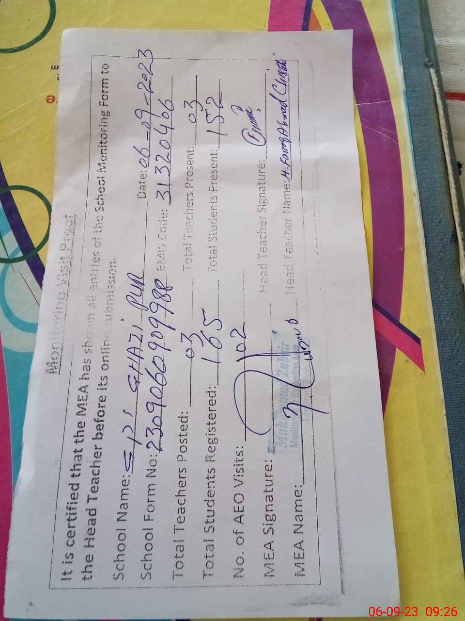 | Attendance Register | Head Teacher | MEA with School | Visit Proof |