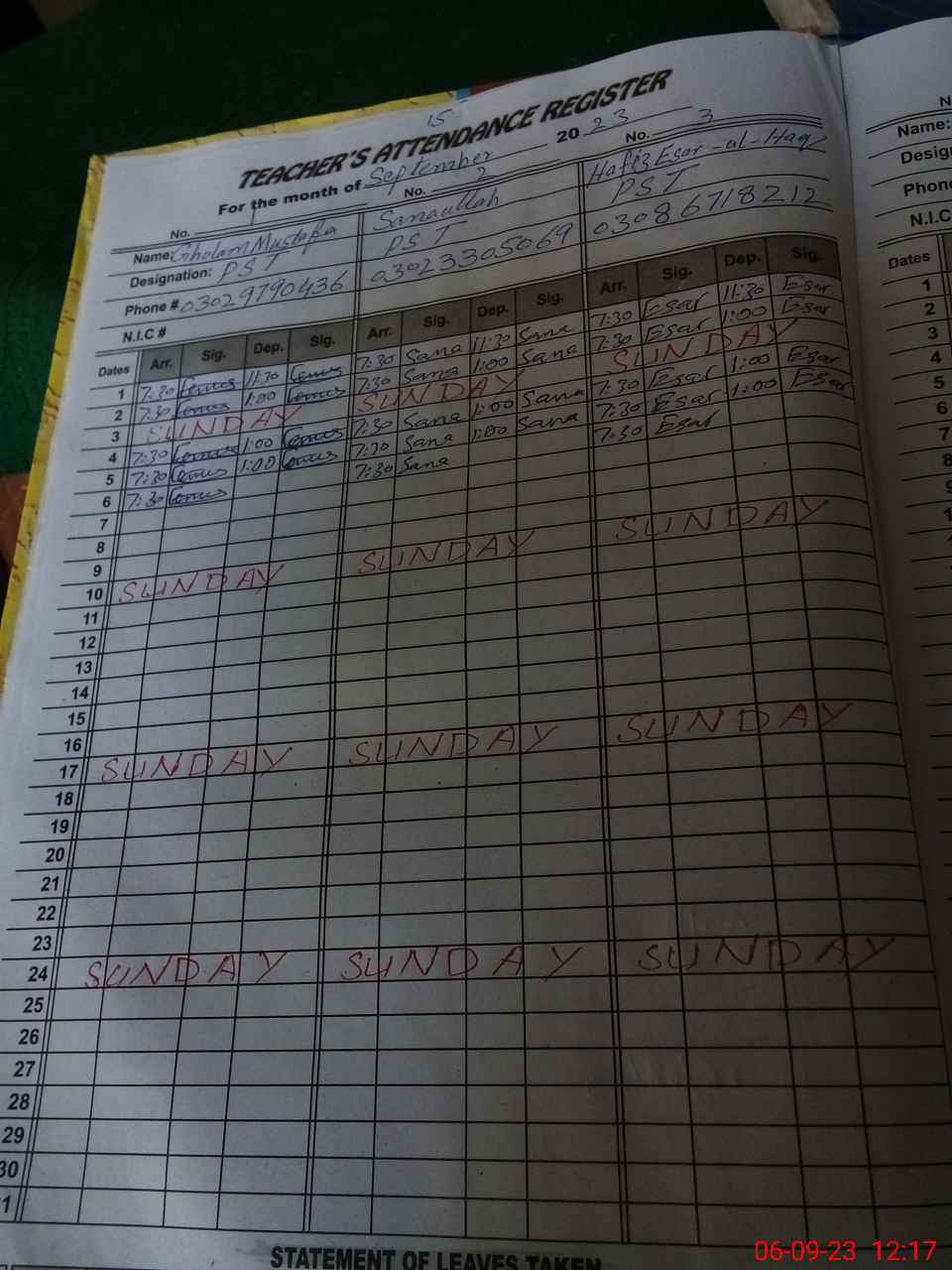 | CNIC | Full Name | Designation | R/C | Absence During Last Calender Month |