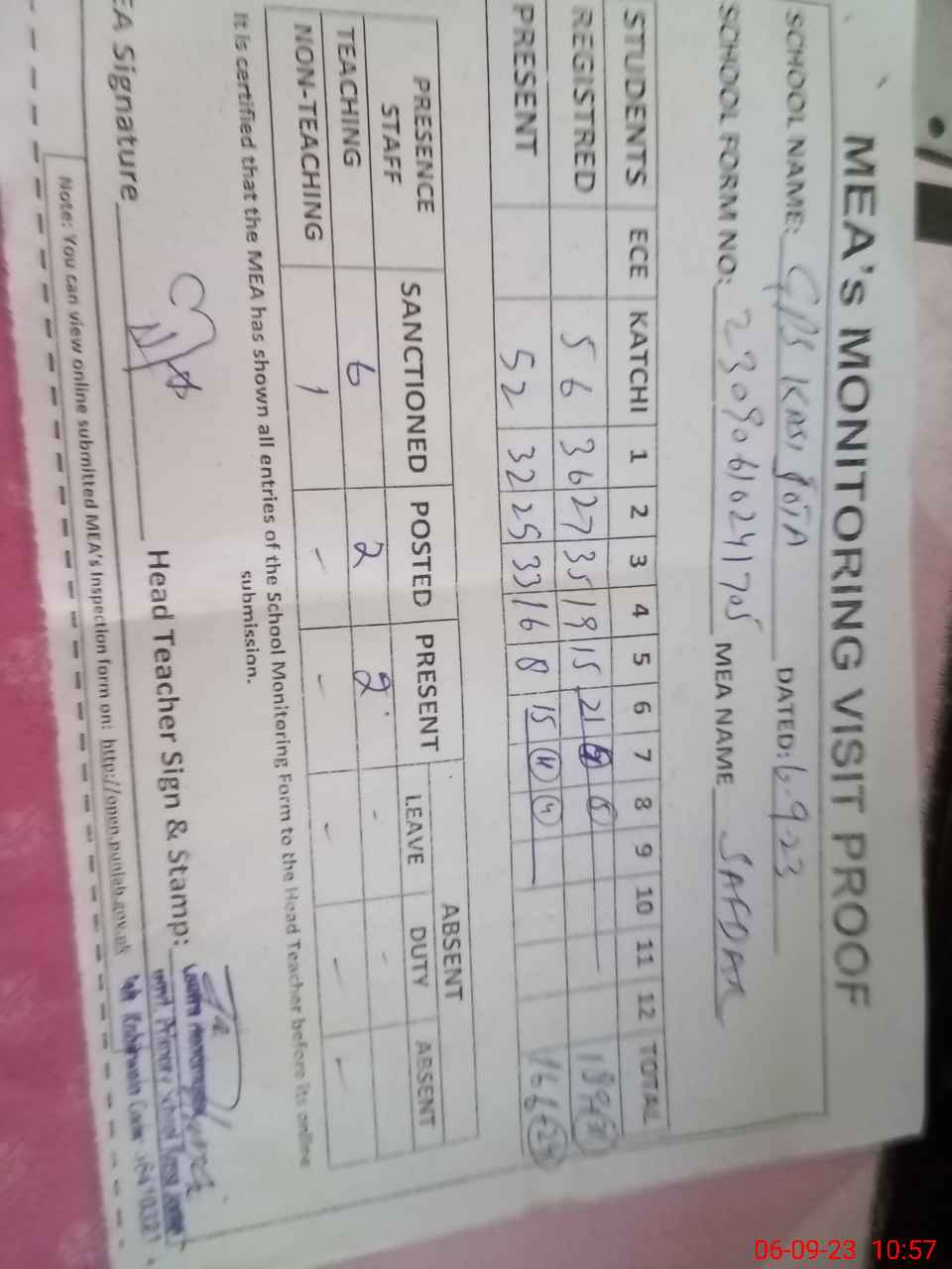 | Attendance Register | Head Teacher | MEA with School | Visit Proof |