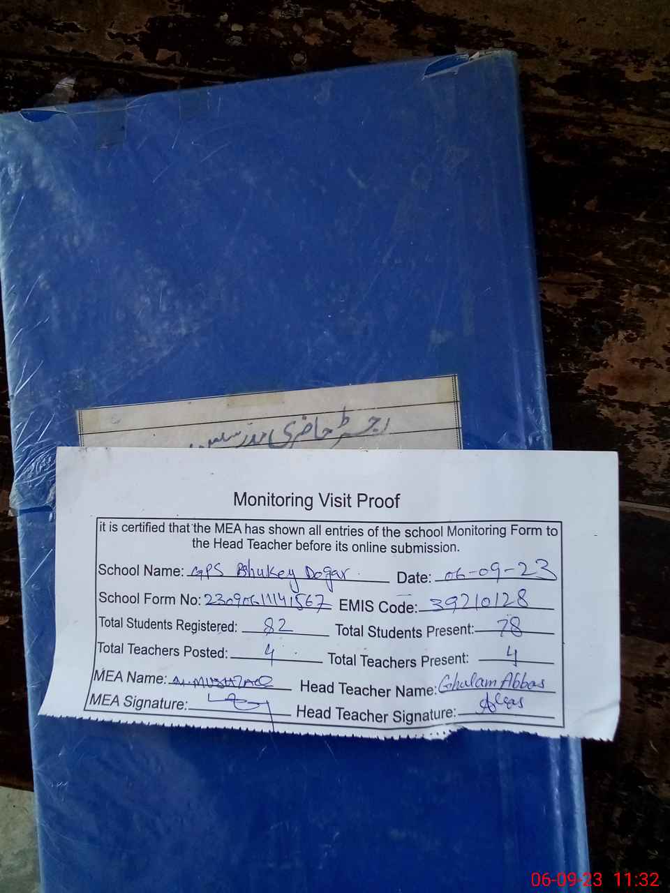 | Attendance Register | Head Teacher | MEA with School | Visit Proof |