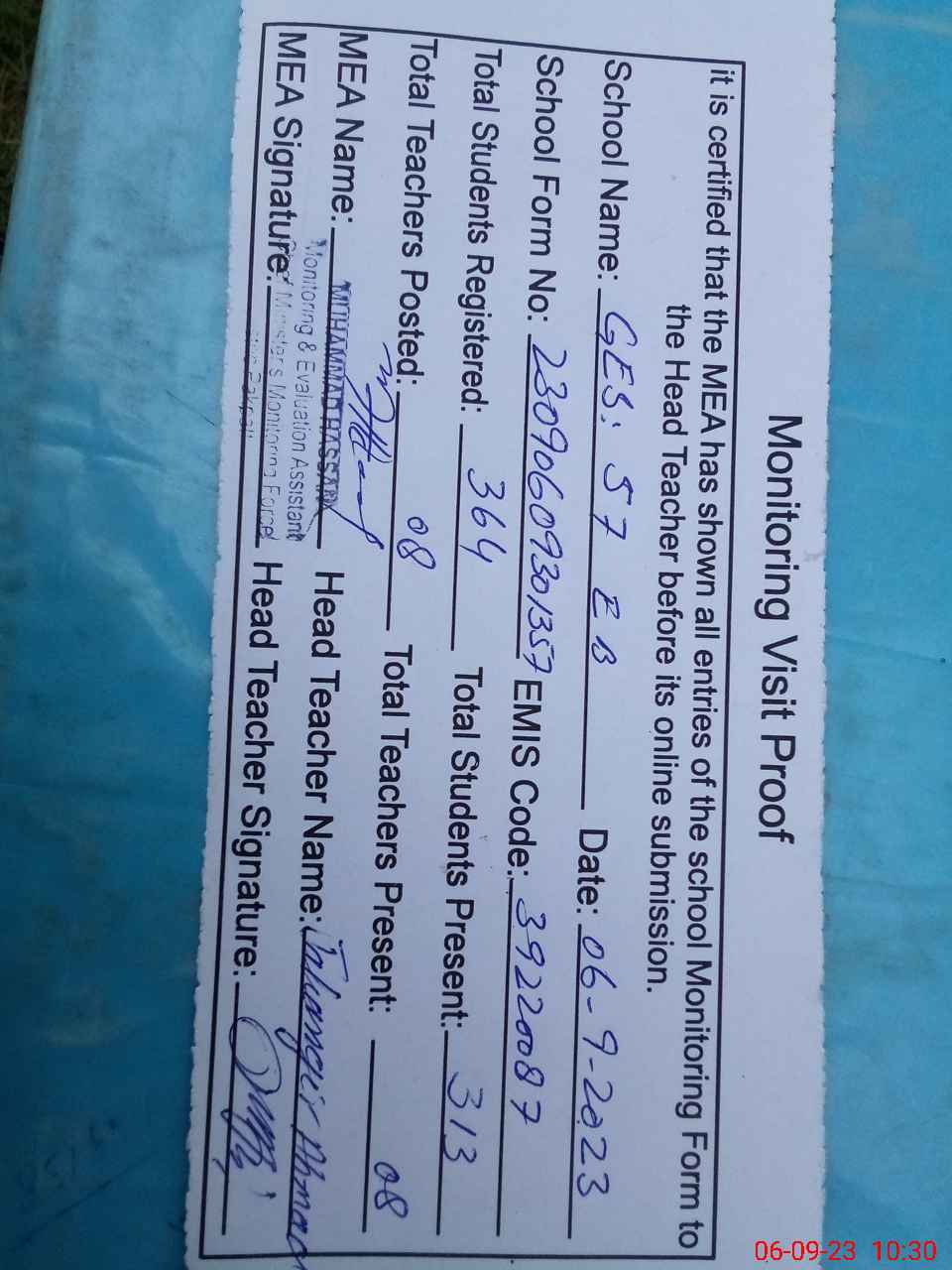 | Attendance Register | Head Teacher | MEA with School | Visit Proof |