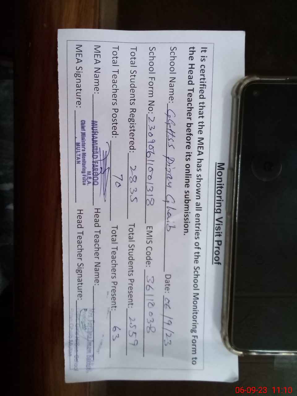| Attendance Register | Head Teacher | MEA with School | Visit Proof |