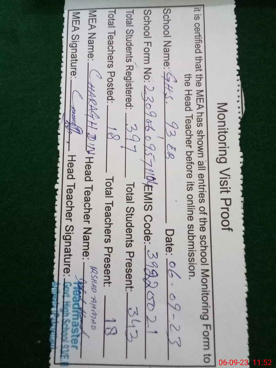 | Attendance Register | Head Teacher | MEA with School | Visit Proof |
