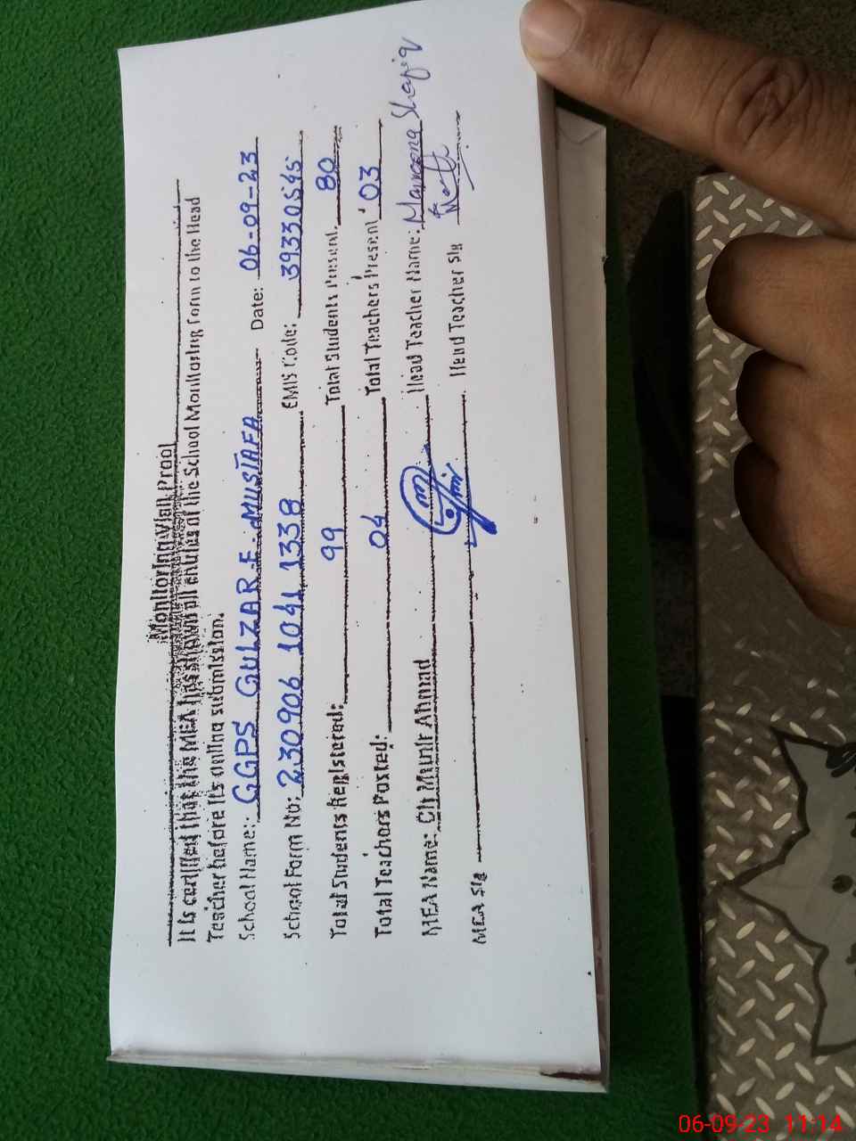 | Attendance Register | Head Teacher | MEA with School | Visit Proof |