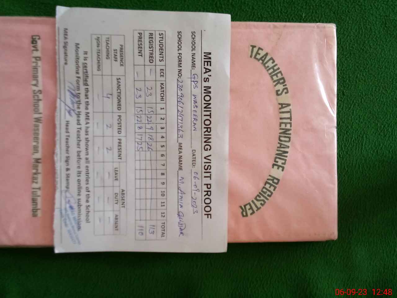 | Attendance Register | Head Teacher | MEA with School | Visit Proof |