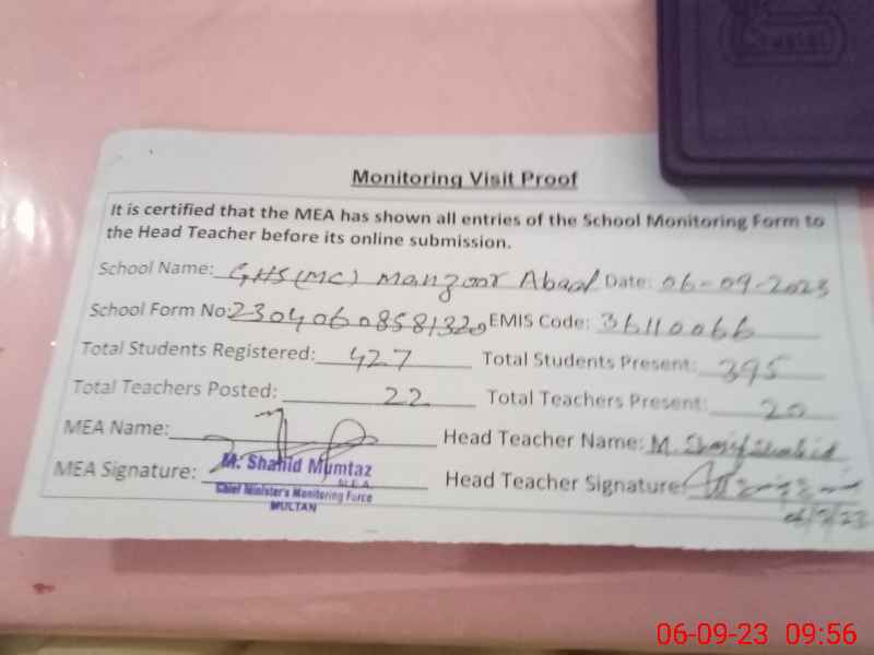 | EMIS Code: 36110066 | Name of School: GHS MC MANZOOR ABAD MULTAN | |||