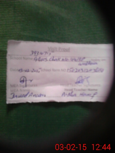 | School Visited by School Health & Nutrition Supervisor (No. of Visits) | 1 | Name1: | HAFIZ IMTIAZ | Name2: | NIL |