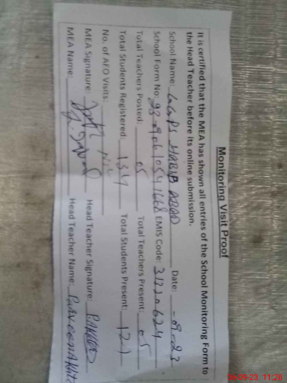 | Attendance Register | Head Teacher | MEA with School | Visit Proof |