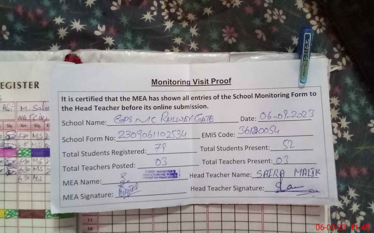 | Attendance Register | Head Teacher | MEA with School | Visit Proof |