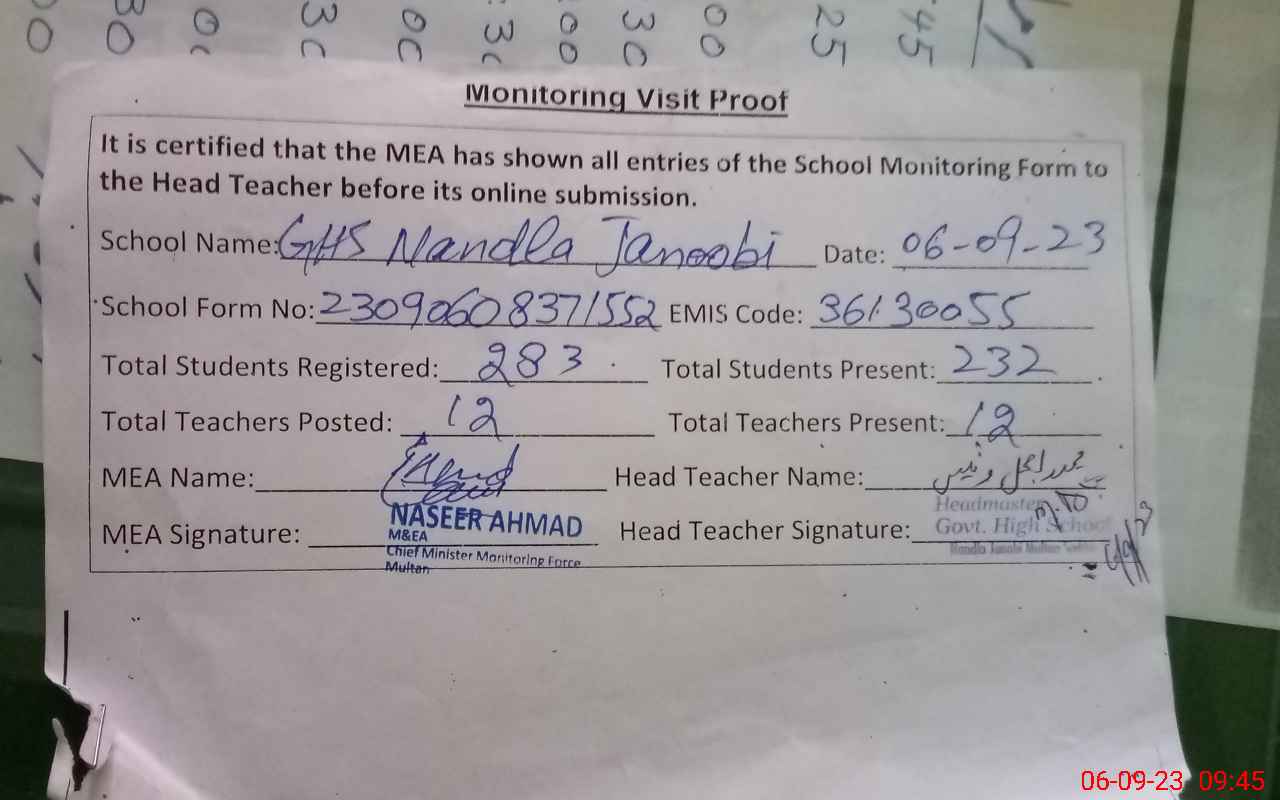 | Monitoring Date: 06-09-2023 | Start Time: 06-09-2023 08:36 AM | End Time: 06-09-2023 09:49 AM | Name of MEA: Na**** Ah**** | |