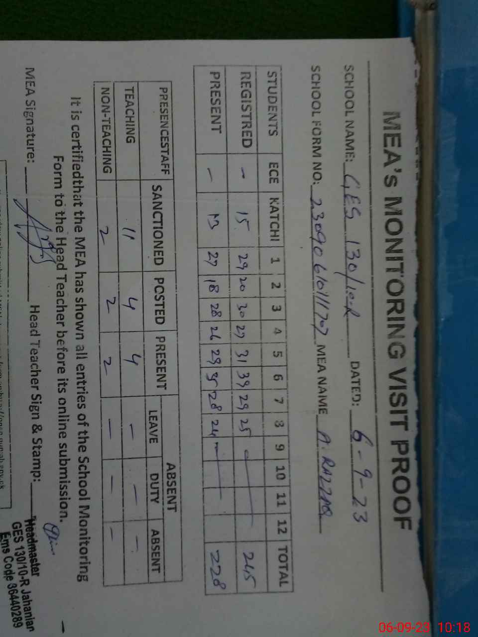 | Attendance Register | Head Teacher | MEA with School | Visit Proof |