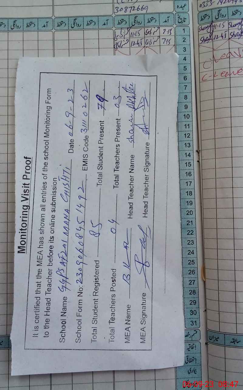 | Attendance Register | Head Teacher | MEA with School | Visit Proof |