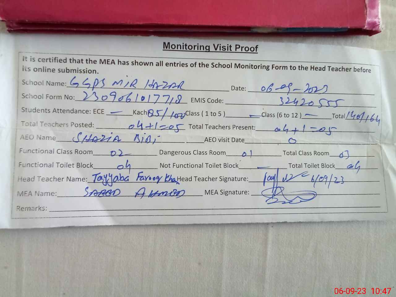 | EMIS Code: 32420555 | Name of School: GGPS MIR HAZAR | |||