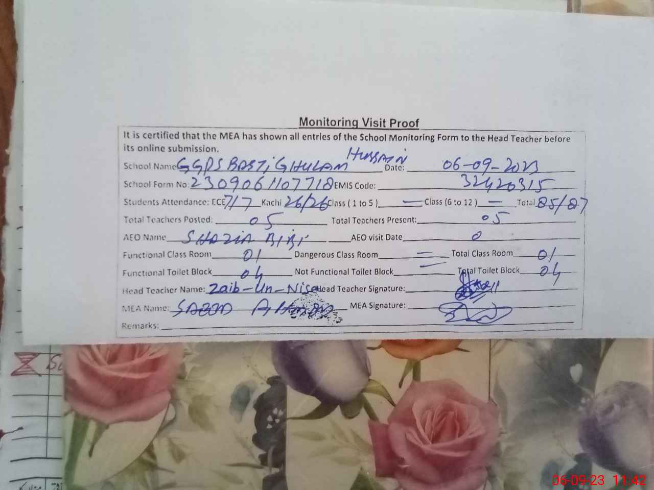 | Attendance Register | Head Teacher | MEA with School | Visit Proof |