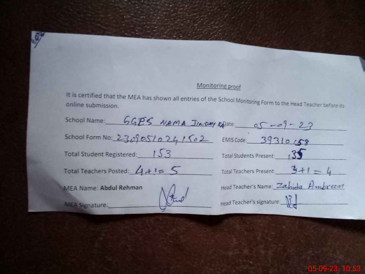 | Attendance Register | Head Teacher | MEA with School | Visit Proof |