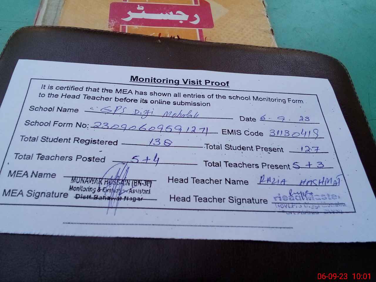 | Attendance Register | Head Teacher | MEA with School | Visit Proof |