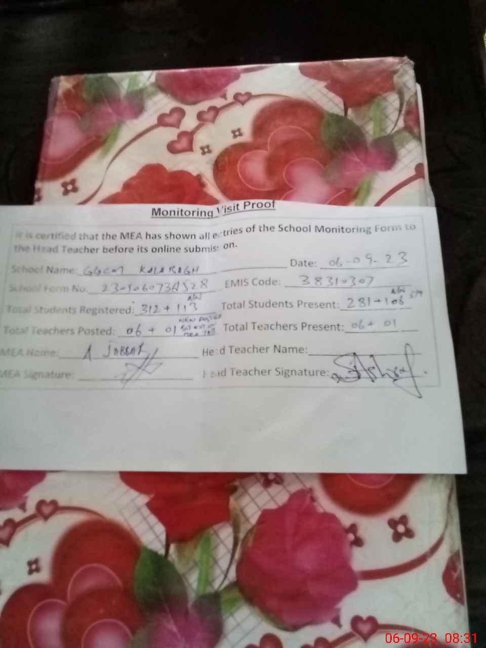 | Attendance Register | Head Teacher | MEA with School | Visit Proof |