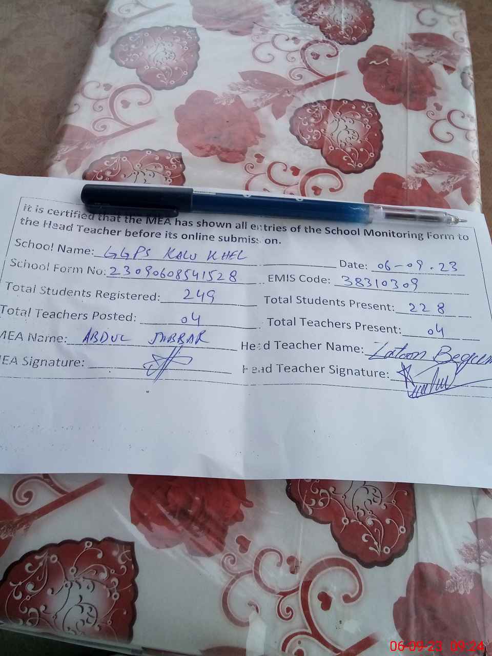 | Certified that this School was Inspected by the Undersigned MEA/DMO Today and the Information Stated Above is as Per Record. | |||||