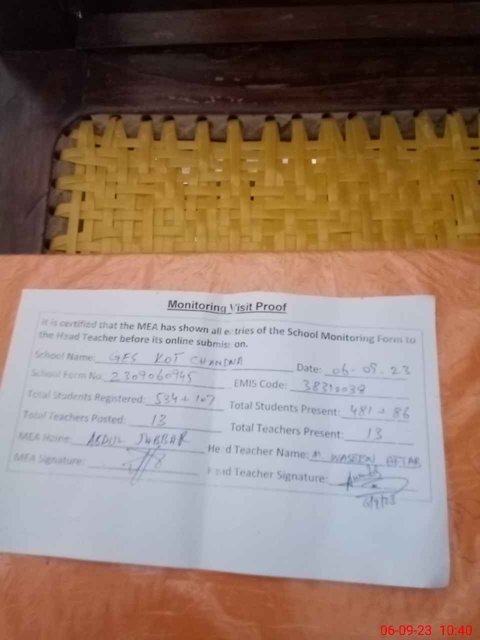 | Certified that this School was Inspected by the Undersigned MEA/DMO Today and the Information Stated Above is as Per Record. | |||||