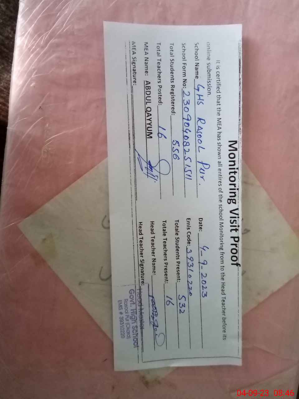 | EMIS Code: 39310220 | Name of School: GHS RASOOL PUR | |||