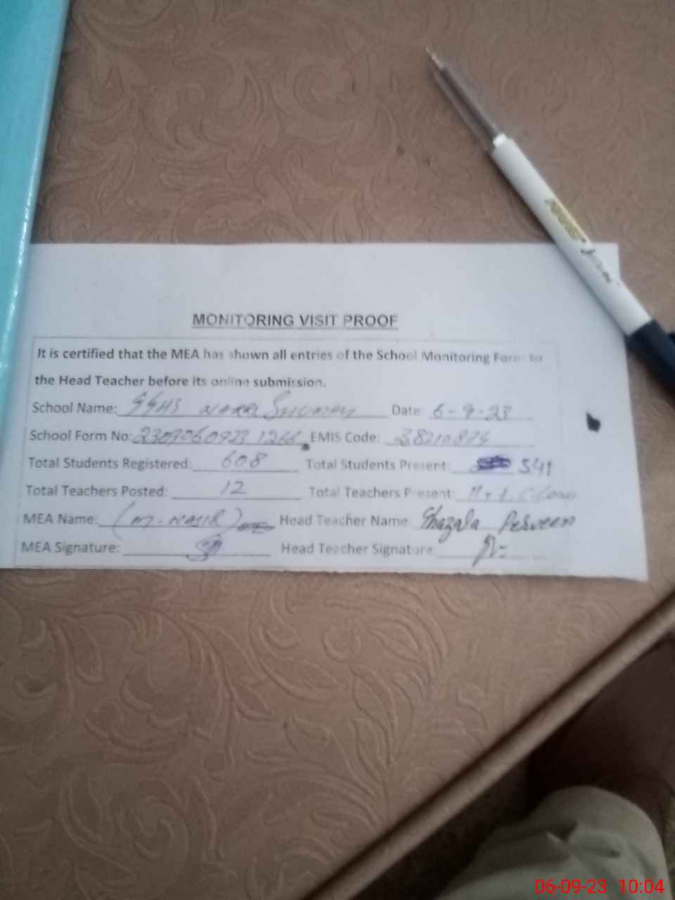 | Attendance Register | Head Teacher | MEA with School | Visit Proof |