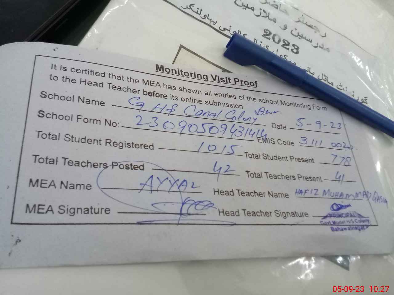| Attendance Register | Head Teacher | MEA with School | Visit Proof |