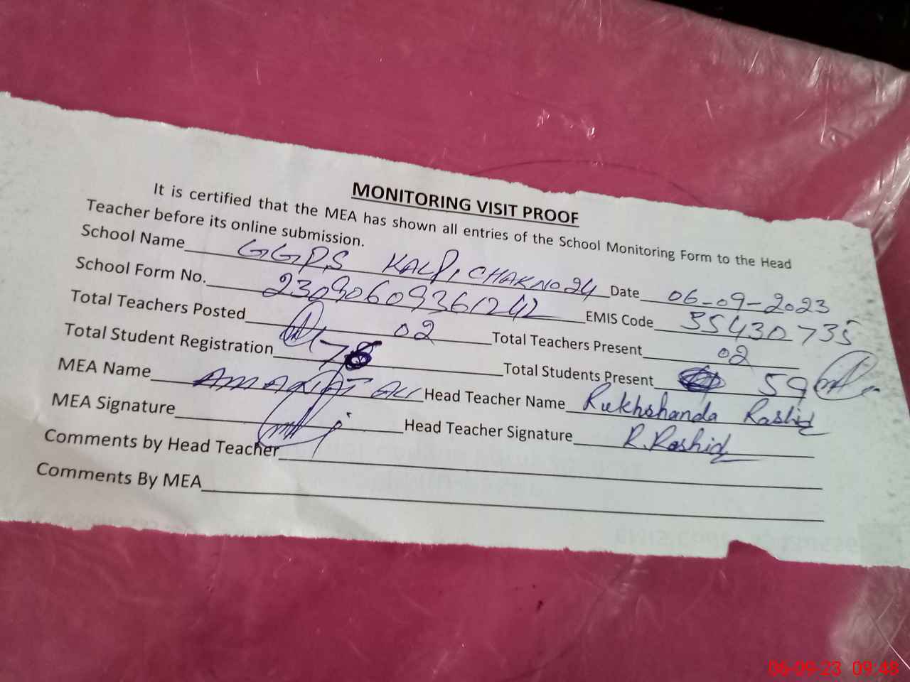| Attendance Register | Head Teacher | MEA with School | Visit Proof |