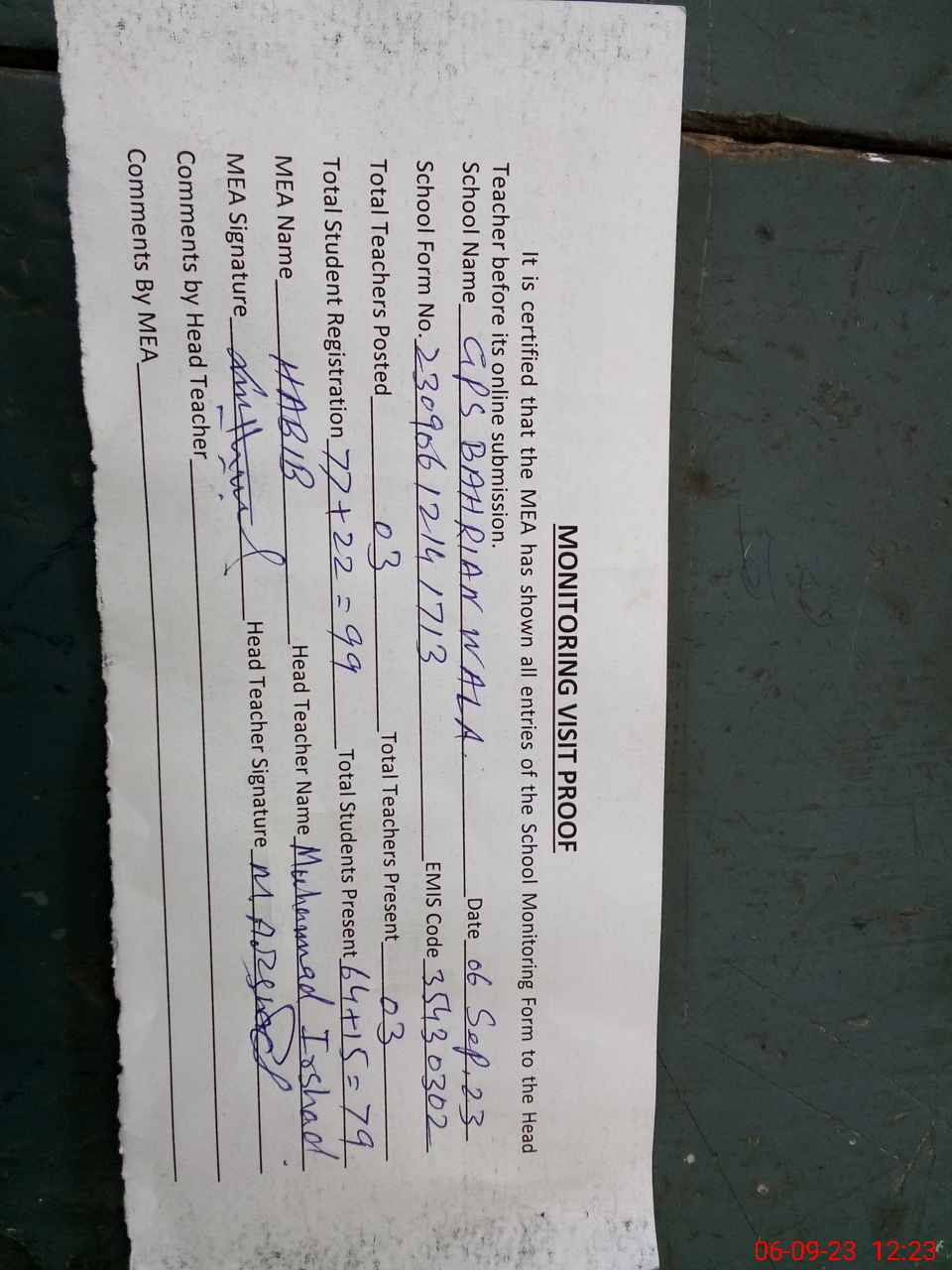 | EMIS Code: 35430302 | Name of School: GPS BAHRIAN WALA | |||