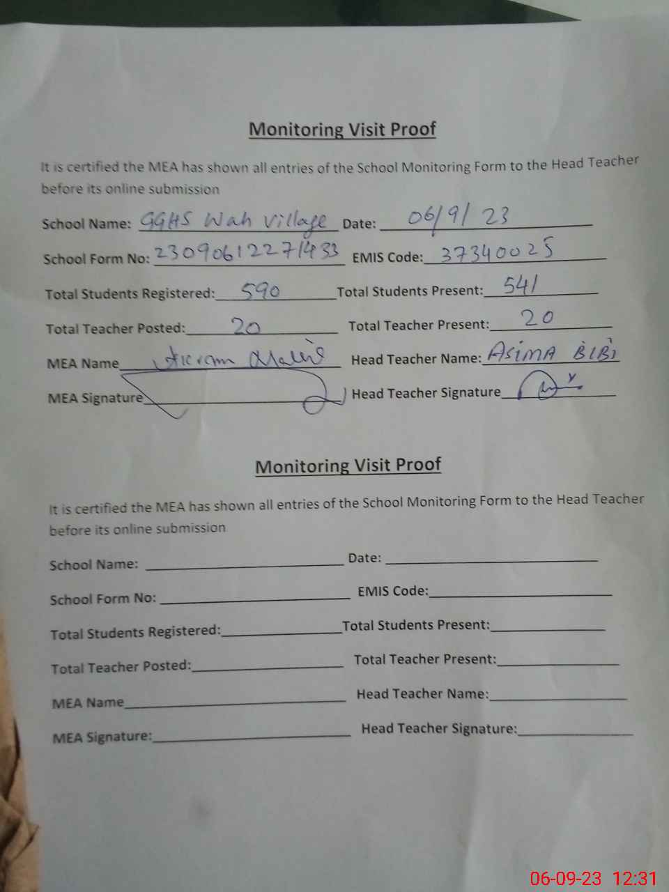 | Attendance Register | Head Teacher | MEA with School | Visit Proof |