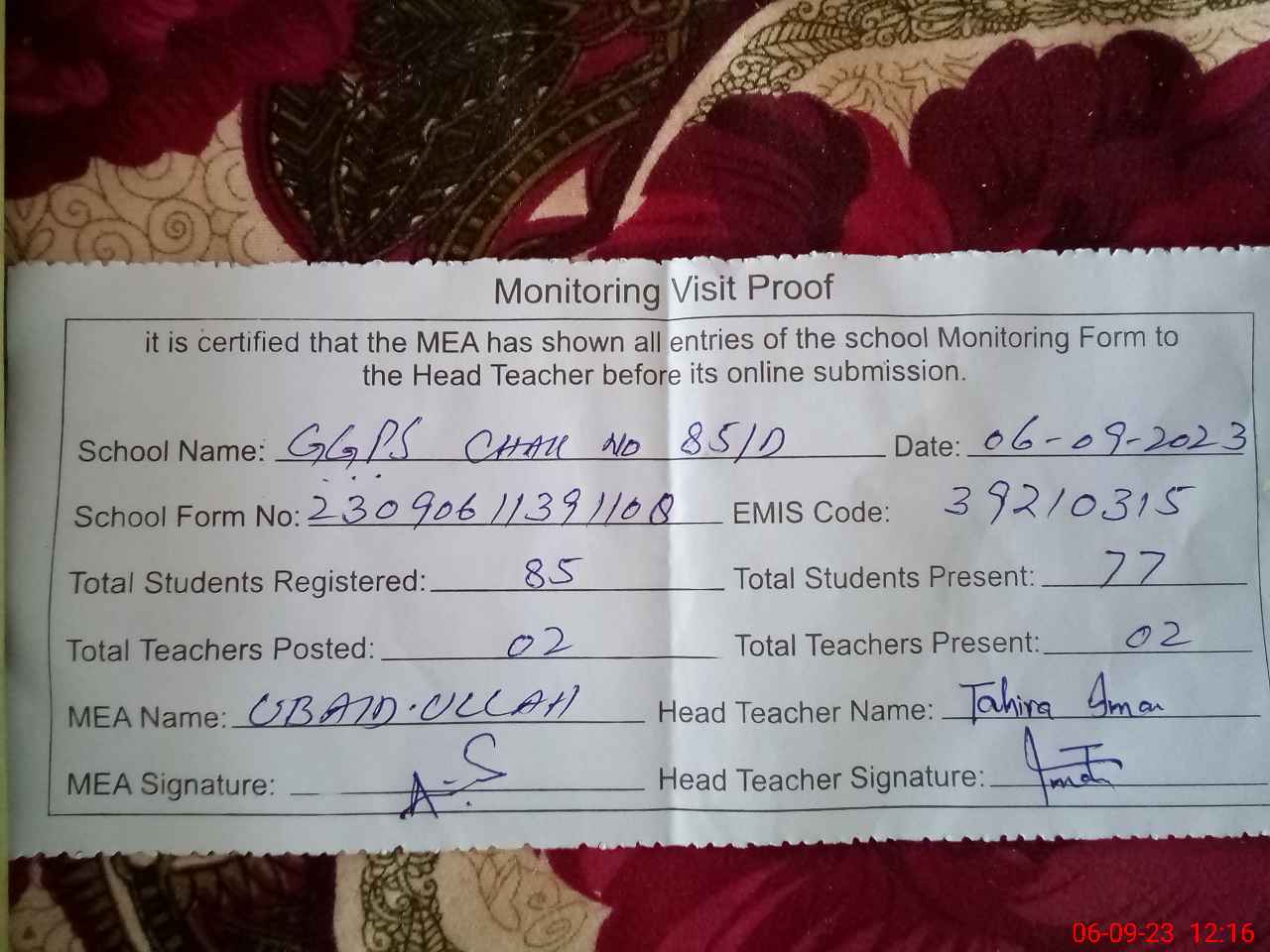 | Attendance Register | Head Teacher | MEA with School | Visit Proof |