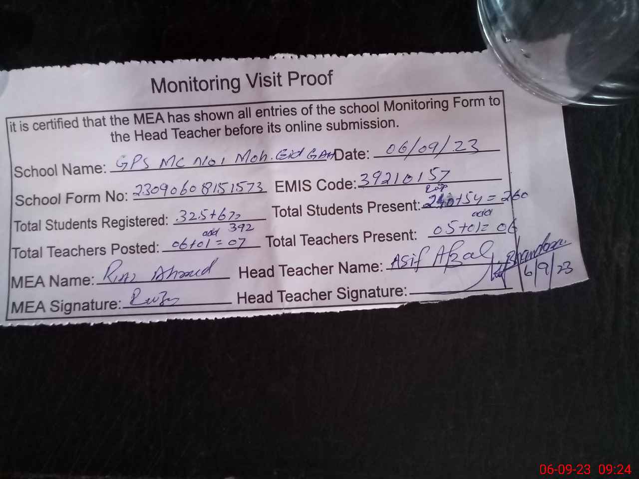 | Attendance Register | Head Teacher | MEA with School | Visit Proof |