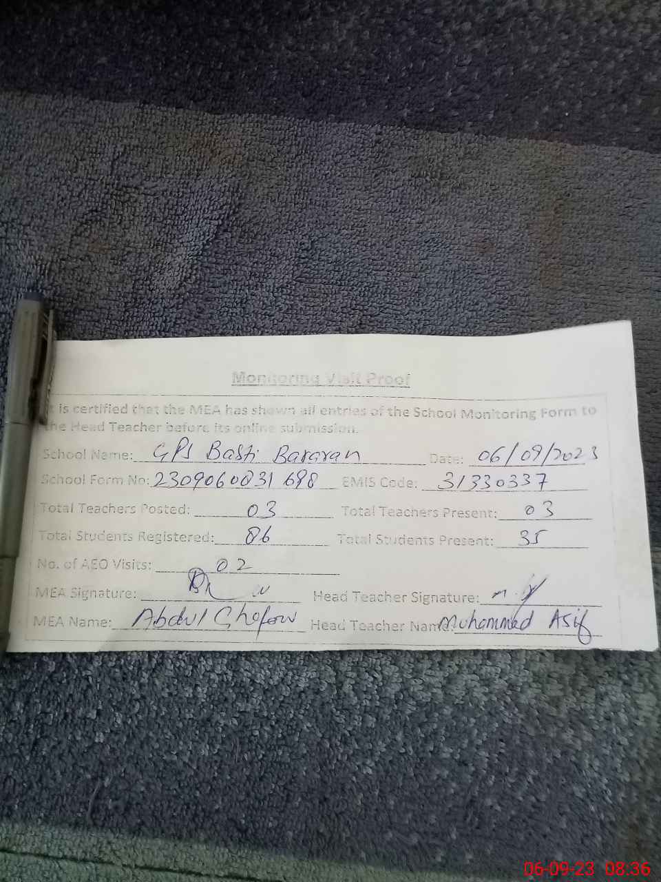 | Attendance Register | Head Teacher | MEA with School | Visit Proof |
