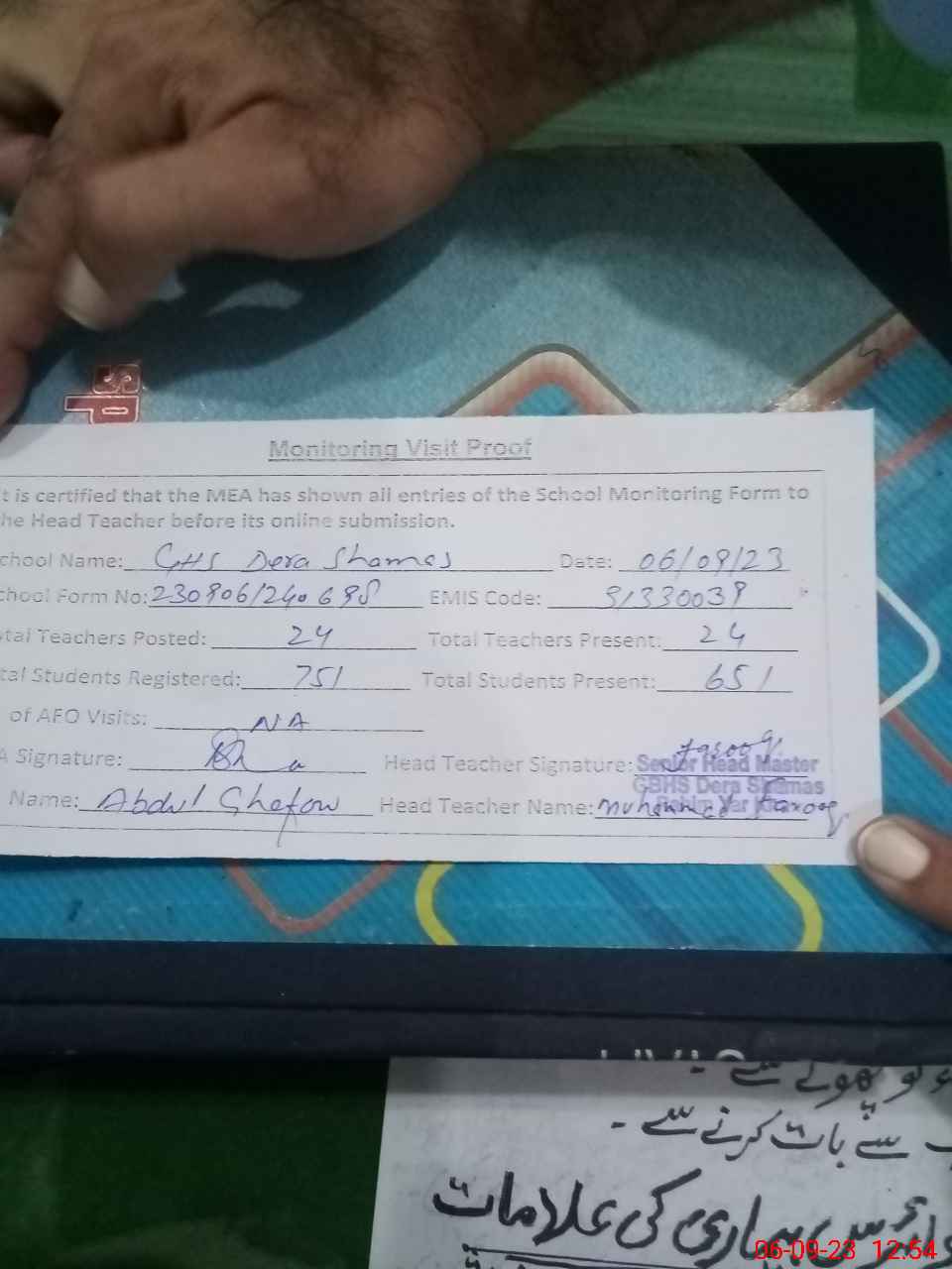 | Attendance Register | Head Teacher | MEA with School | Visit Proof |
