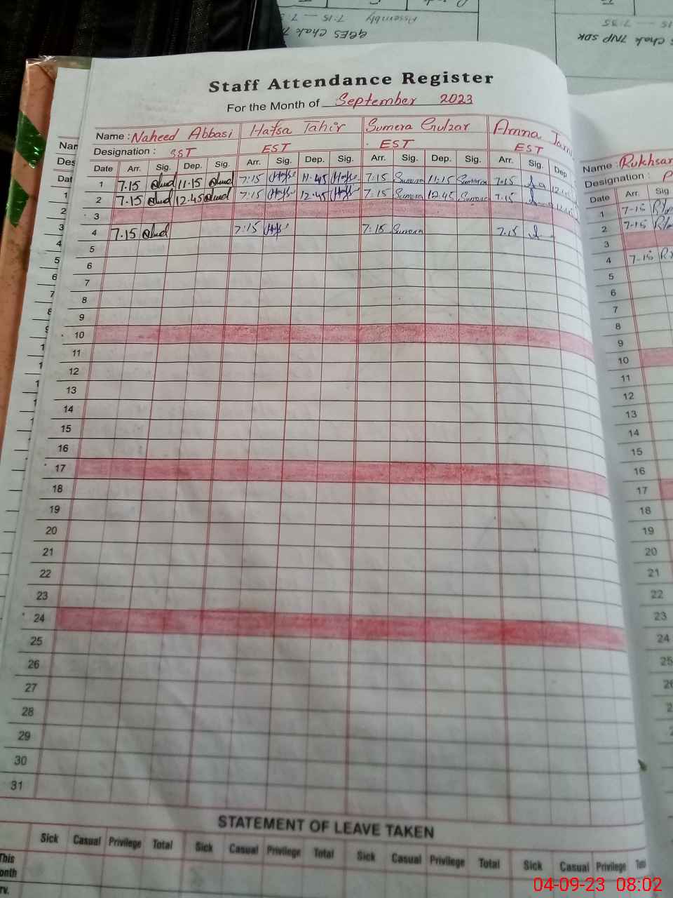 | Remarks (Use Separate Page if Required): Sst Naheed abbasi posted to this school wef 22 July 2022 but not yet updated on sis | |||||