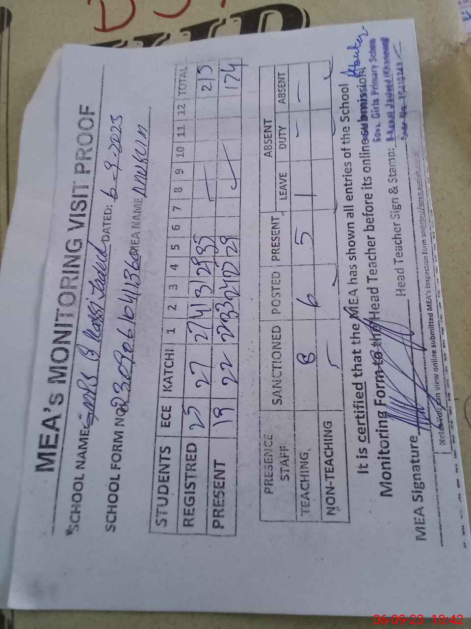 | Attendance Register | Head Teacher | MEA with School | Visit Proof |