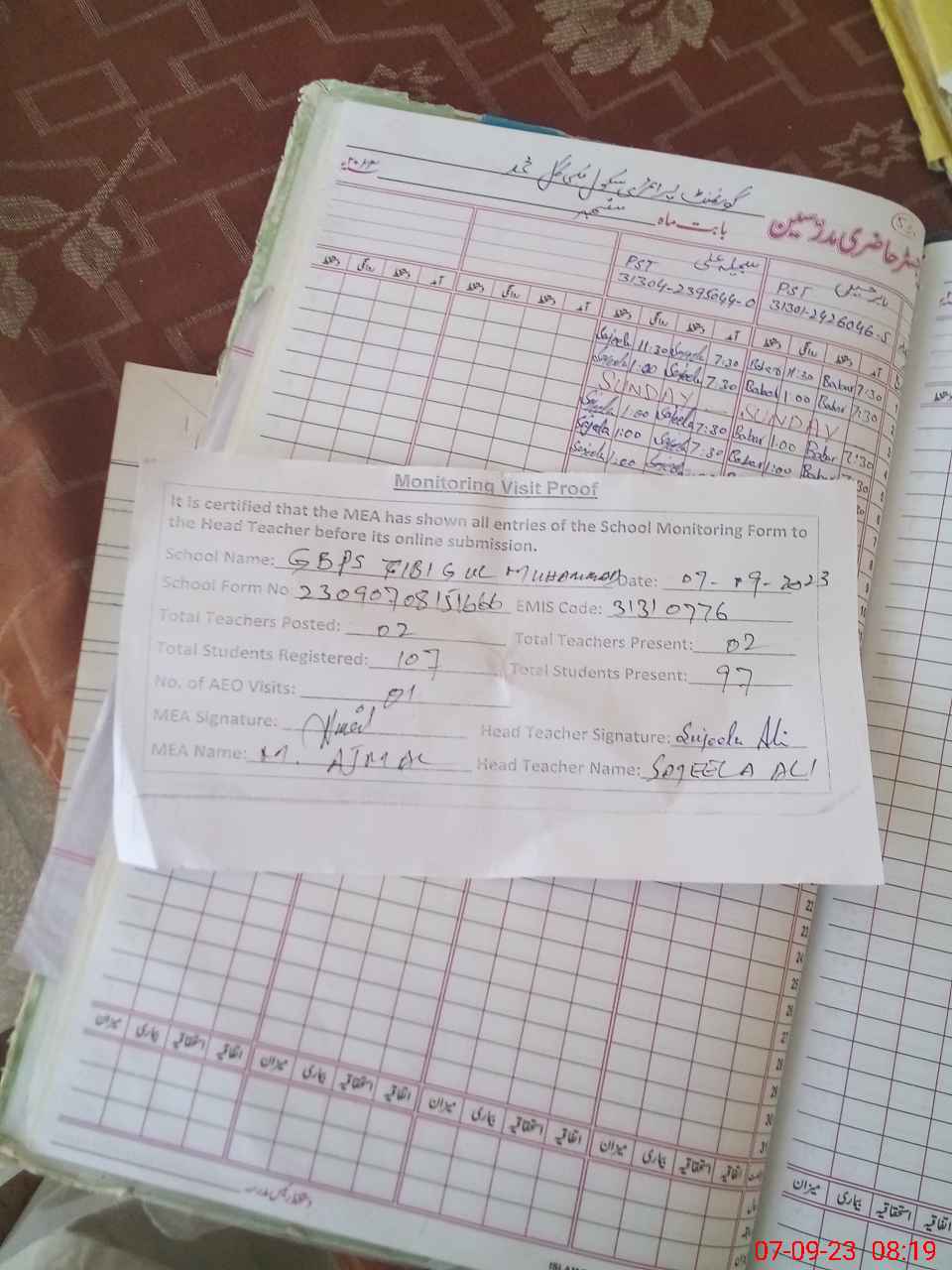 | Attendance Register | Head Teacher | MEA with School | Visit Proof |