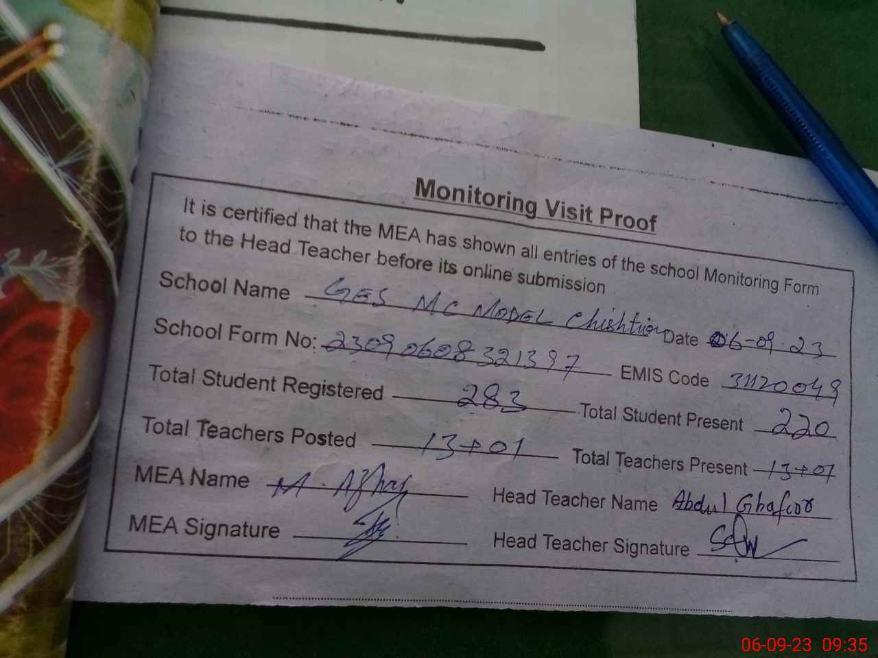 | EMIS Code: 31120049 | Name of School: GES MC MODEL CHISHTIAN | |||