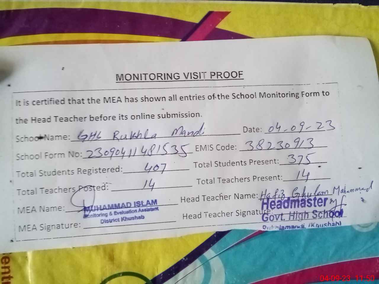 | Attendance Register | Head Teacher | MEA with School | Visit Proof |
