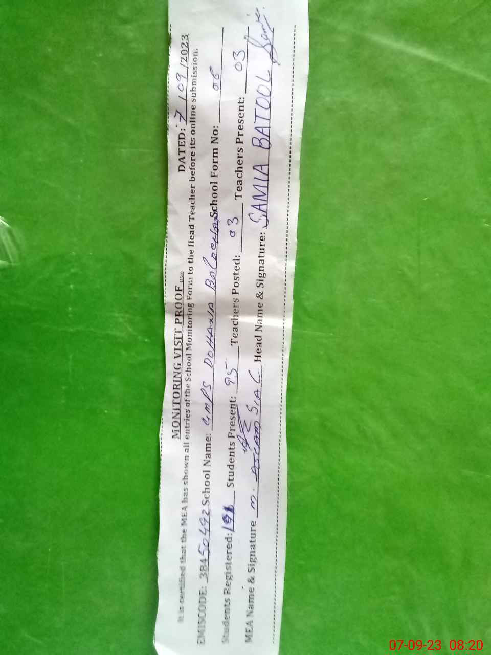 | Attendance Register | Head Teacher | MEA with School | Visit Proof |