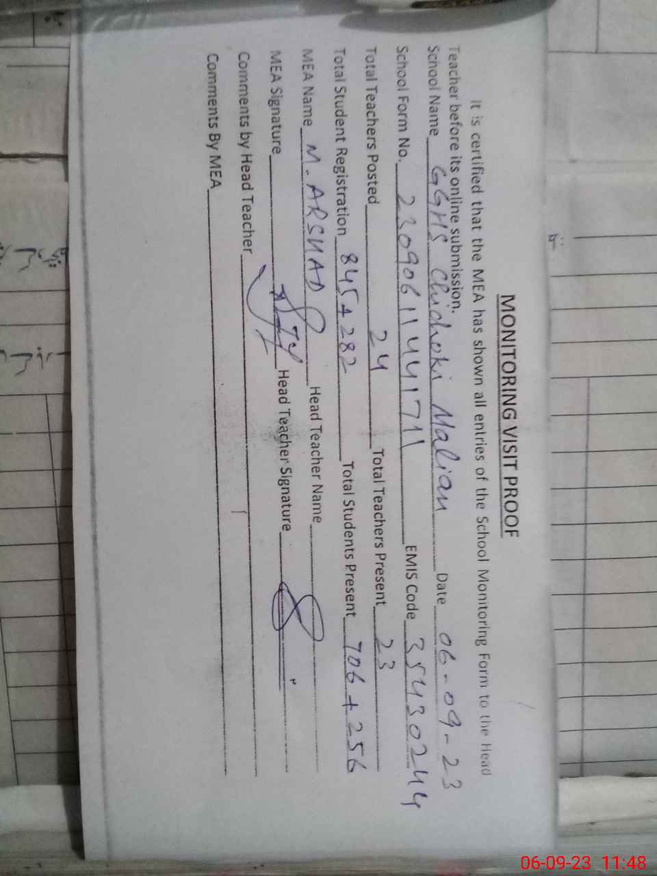| Attendance Register | Head Teacher | MEA with School | Visit Proof |